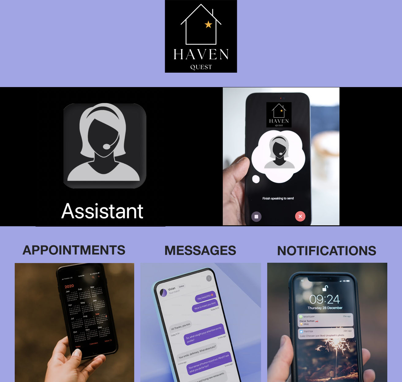 Communication through the Haven Quest Assistant connects users to resources, appointments, notifications and messaging system. The AI powered assistant is voice enabled with real-time solutions for users any time they need guidance.